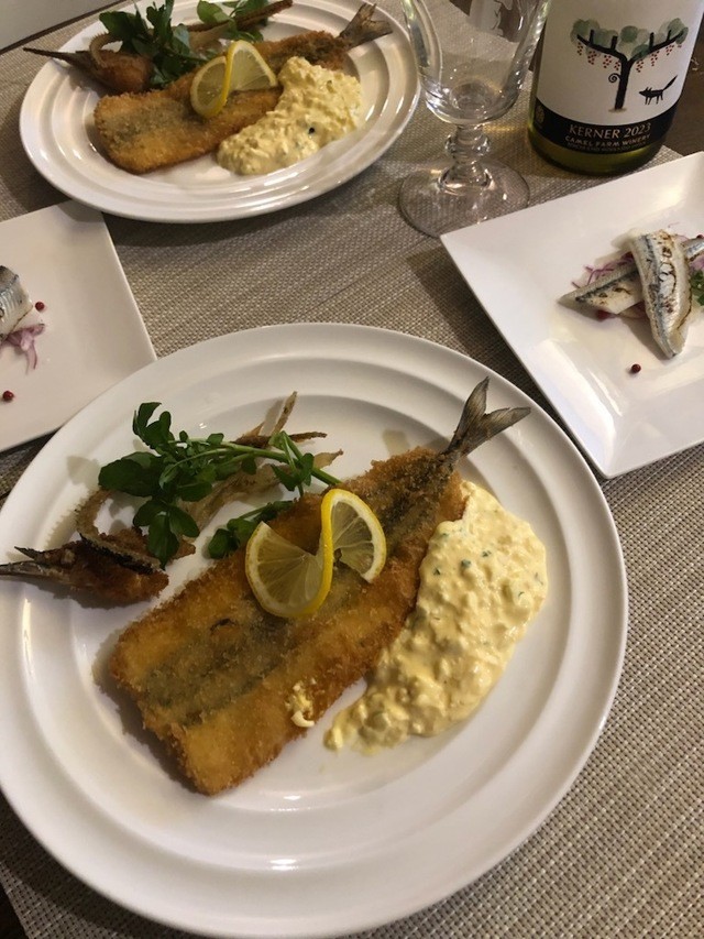 サヨリのフライは身がふっくらしてタルタルソースですね。今夜は北海道余市の白ワイン。